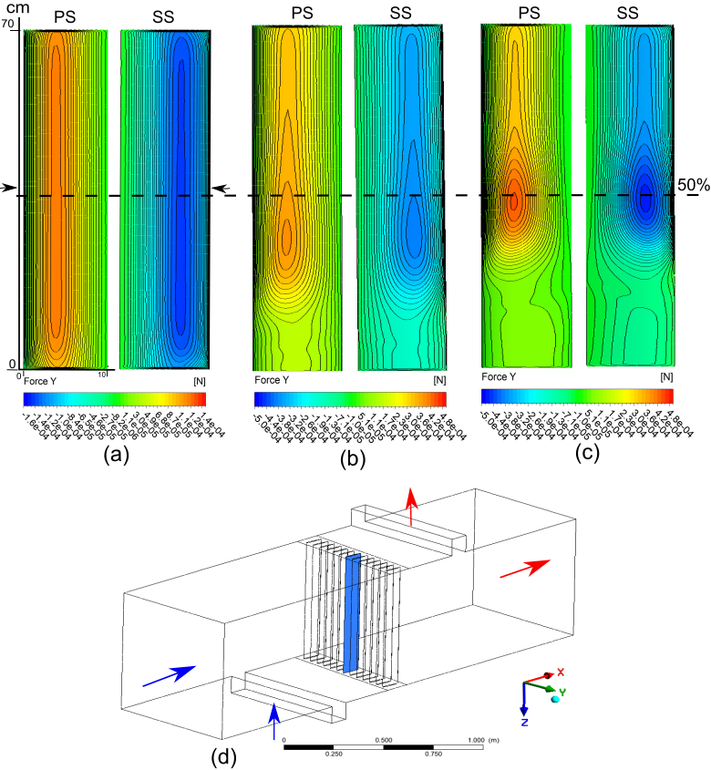 Figure 2 – The contour plot of Force ( lift) distribution on the mid blade of 3D cascade for 5m/s mainflow at aoa 5 degrees for different bypass (BP) velocities (a) Inlet 5m/s and BP velocity 0 m/s (b) Inlet 5m/s and BP velocity 5 m/s ( c) Inlet 5m/s and BP velocity 10 m/s. (d) Schematic diagram of the test section
