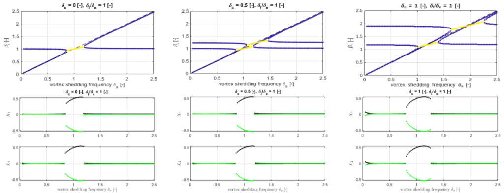 Results gained using model with two profiles show that the presence of nonlinear coupling results in vibration synchronization and to the fact that because of the synchronization, the out-of-phase vibration mode during lock-in regime does not exhibit, Fig. 3.